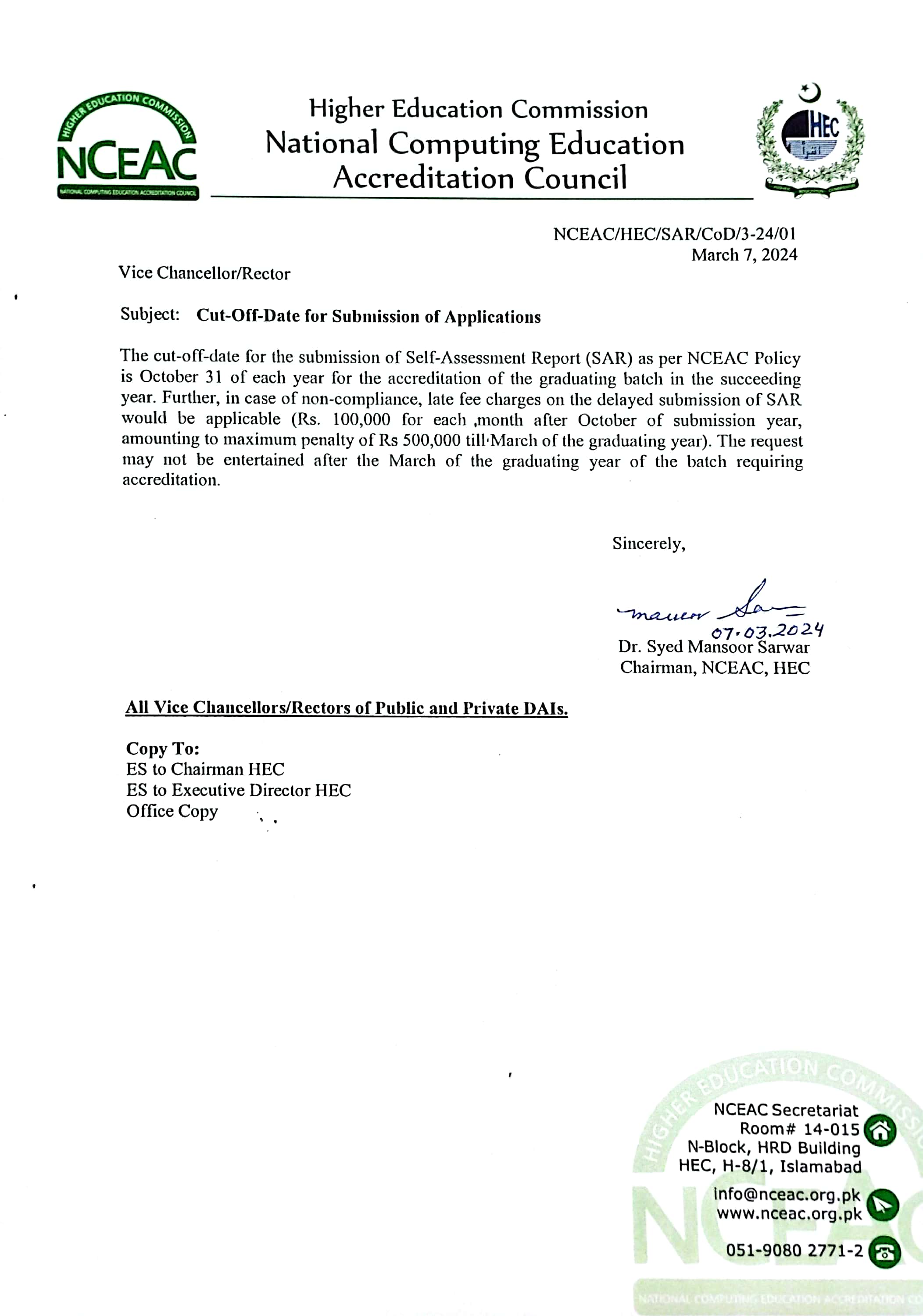 Cut-off Date for Submission of Application